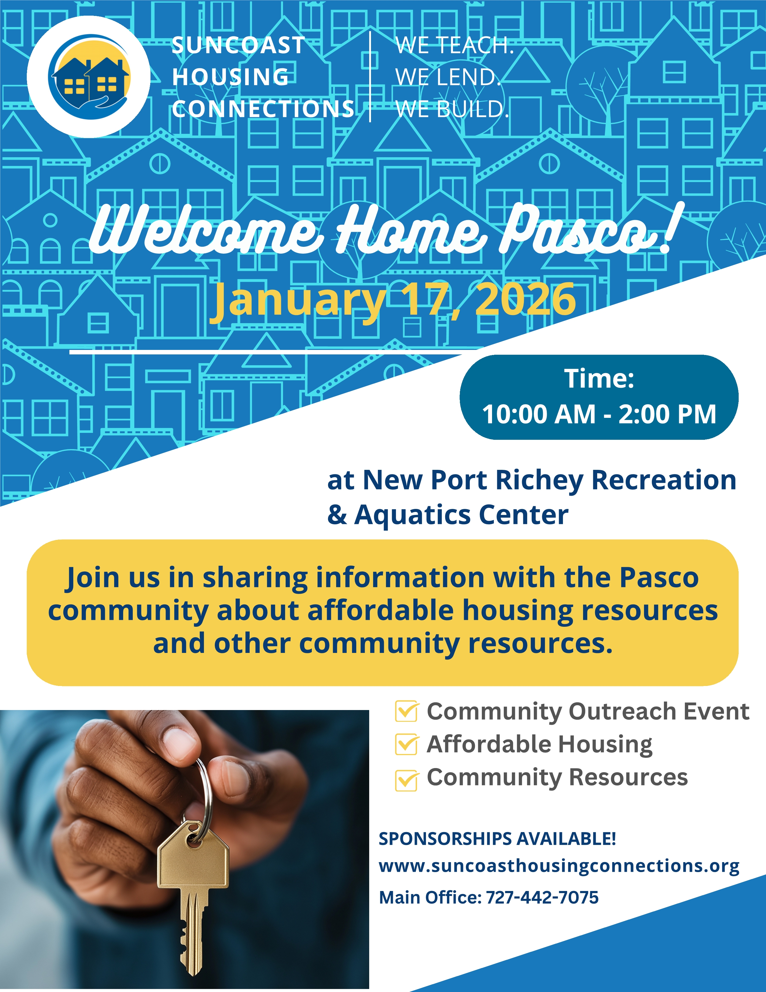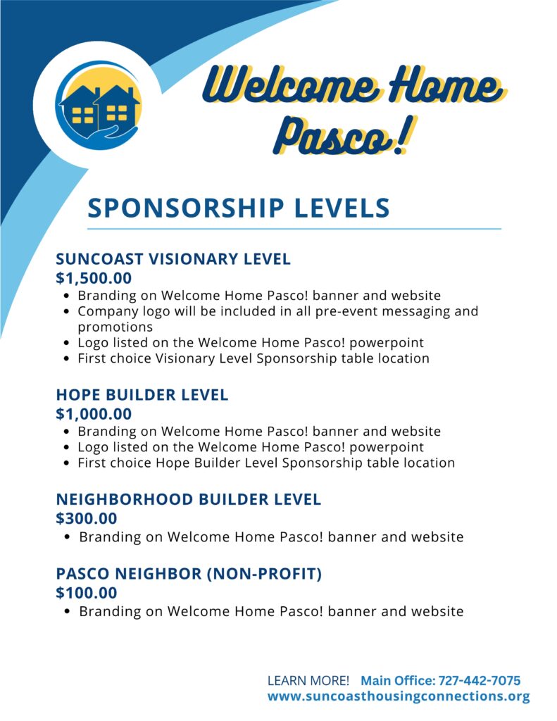 Pasco Event Sponsor at the Suncoast Visionary Level Sponsor at the Hope Builder Level Sponsor at the Neighborhood Builder Level Sponsor at the Pasco Neighbor (Non-Profit) Make a Welcome Home Pasco donation Click here for more sponsorship information